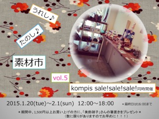 1/20~2/1から東京都目黒区「Gallery KOMPIS」さまで開催される「うれし!たのし!素材市vol.5」に出展いたします。