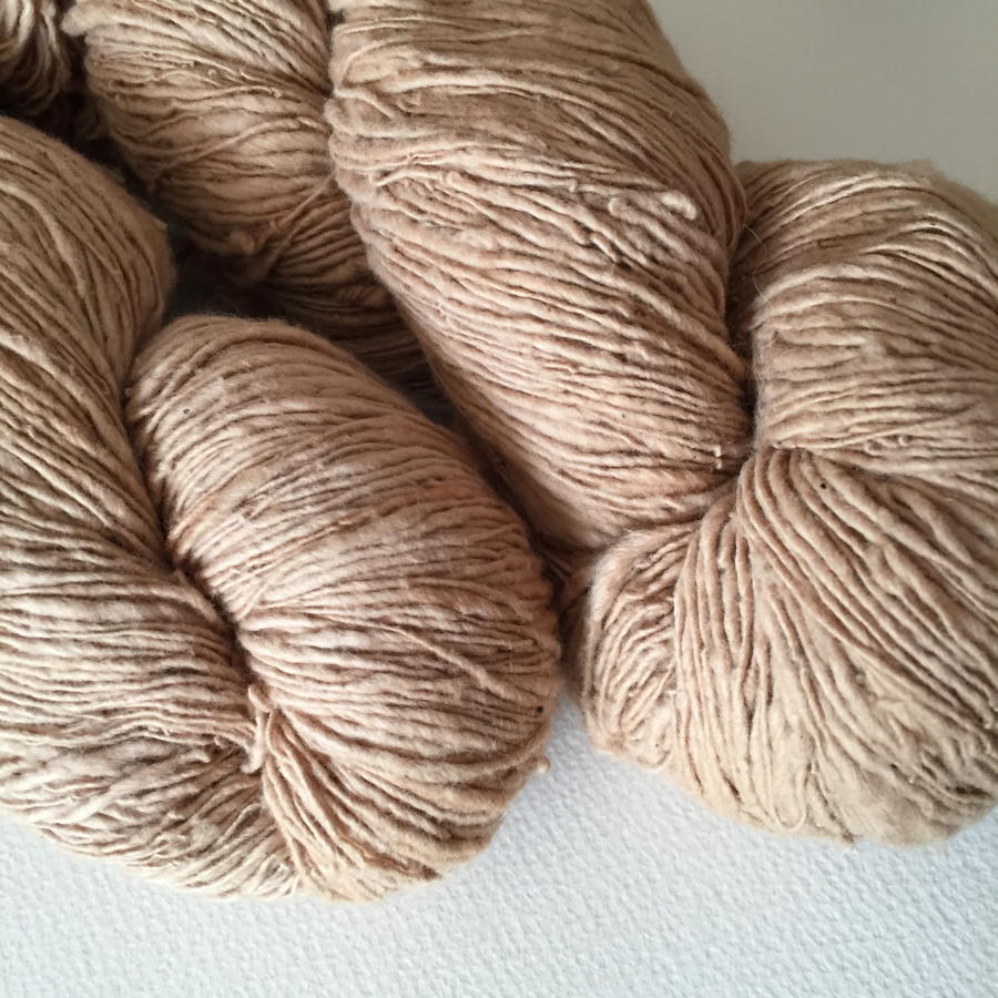 昔ひつじやでお取り扱いしていた「ガラ紡糸(機械紡績糸)」を紅茶染めしたものです。