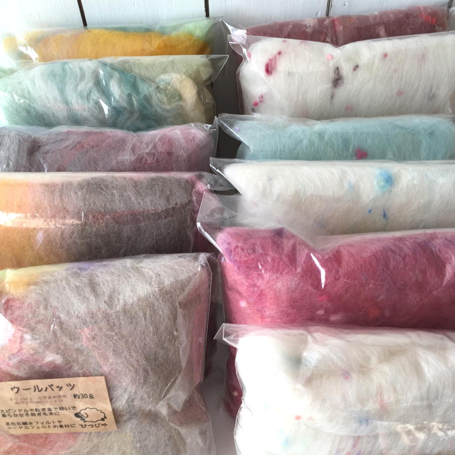 120g巻きメリノ、様々なカラーを1パックに入れた詰め合わせパック(メリノ/コリデール)、バッツ(メリノ)など。
