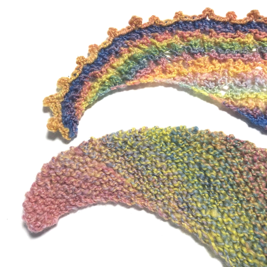 上記写真は120g巻きのサンプルとして作成した、三日月(猫の爪)形ショールとその両端です(あえて晒します・笑)。