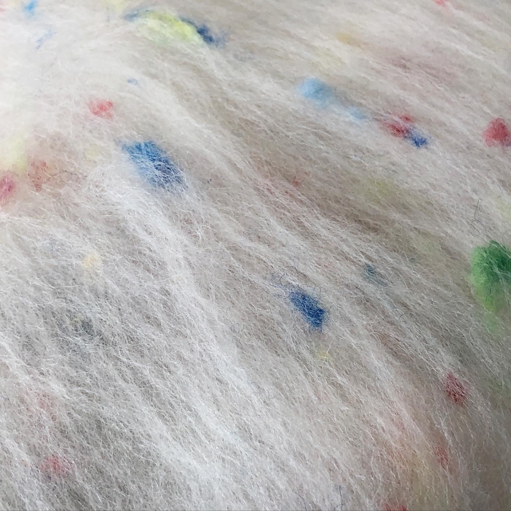 以前取り扱っていた「ネップ」よりも崩れやすいので「ウール粒としての単体利用」は難しいのですが、地の羊毛ととても馴染みやすく、紡いでいても弾かれにくい仕様です。